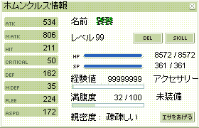 | Lv | HP | SP | ATK | MATK | HIT | CRI | DEF | MDEF | FLEE | ASPD | STR | AGI | VIT | INT | DEX | LUK | HPR | SPR |